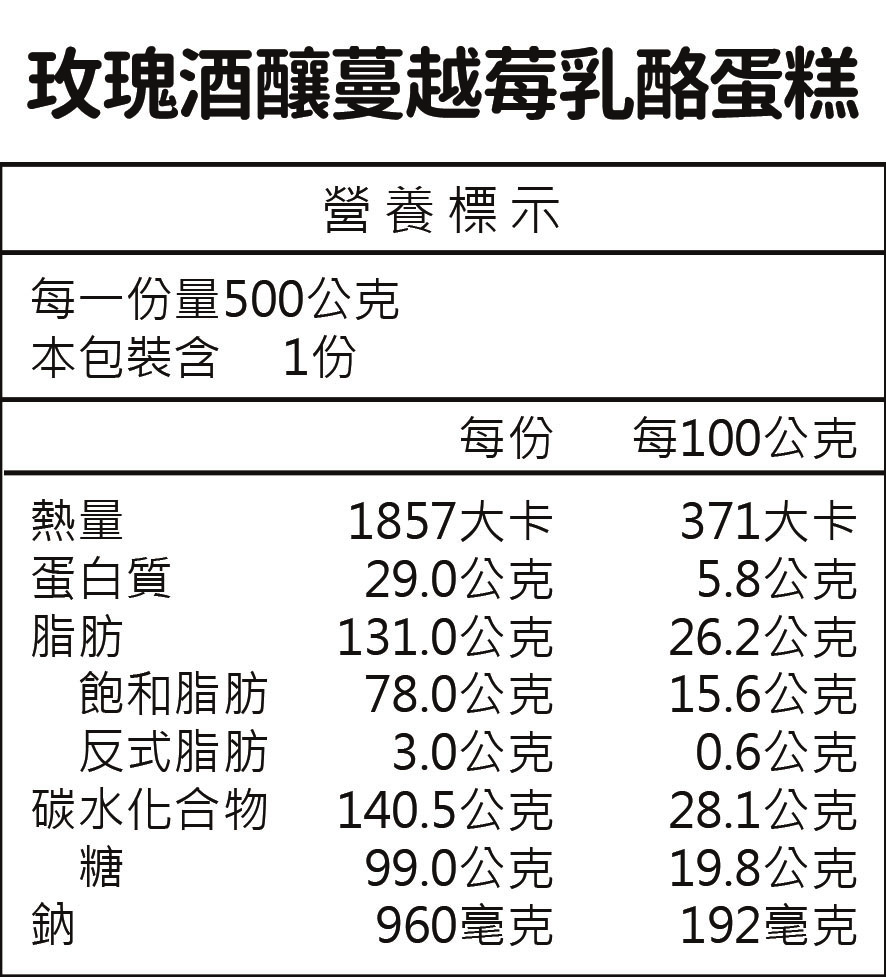 成分: 奶油起司(牛奶、乳脂、鹽、刺槐豆膠、關華豆膠、乳酸菌)、雞蛋、糖、奶油、餅乾碎[小麥粉、糖、植物油(棕櫚油、油菜籽油)、糖漿、小蘇打、大豆粉、鹽、肉桂]、蔓越莓(蔓越莓、糖、葵花油)、糖漿[葡萄糖漿、水、糖、柑橘果膠、檸檬酸、檸檬酸鈉、防腐劑(己二烯酸鉀)、香料(柑橘)]、水、酸奶油[乳脂、水、脫脂乳粉、乙醯化己二酸二澱粉、明膠(取自牛皮)、乳酸、鹽、乳酸菌]、脂肪抹醬[水、完全氫化棕櫚仁油(含大豆卵磷脂)、完全氫化椰子油、酪乳固形物、精煉棕櫚仁油、羥丙基磷酸二澱粉、聚山梨醇酐脂肪酸酯六十、磷酸氫二鈉、脂肪酸甘油酯、糖、關華豆膠、刺槐豆膠、大豆卵磷脂、鹿角菜膠、β-胡蘿蔔素]、玉米澱粉、葡萄酒、玫瑰花醬(玫瑰、糖、蘋果、檸檬汁)、蜂蜜風味糖漿(果糖、蜂蜜、香料、食用焦糖色素)、乾燥玫瑰花