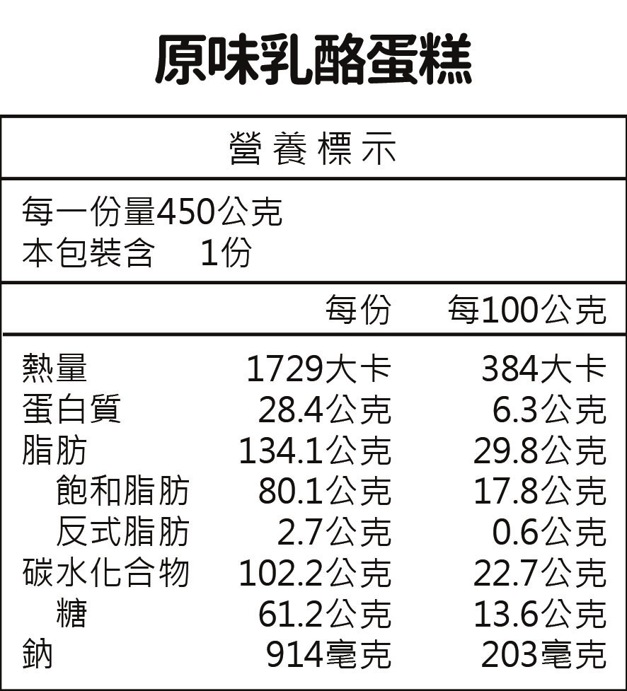 成分:奶油起司(牛奶、乳脂、鹽、刺槐豆膠、關華豆膠、乳酸菌)、雞蛋、糖、奶油、餅乾碎[小麥粉、糖、植物油(棕櫚油、油菜籽油)、糖漿、小蘇打、大豆粉、鹽、肉桂]、酸奶油[乳脂、水、脫脂乳粉、乙醯化己二酸二澱粉、明膠(取自牛皮)、乳酸、鹽、乳酸菌]、糖漿[葡萄糖漿、水、糖、柑橘果膠、檸檬酸、檸檬酸鈉、防腐劑(己二烯酸鉀)、香料(柑橘)]、脂肪抹醬[水、完全氫化棕櫚仁油(含大豆卵磷脂)、完全氫化椰子油、酪乳固形物、精煉棕櫚仁油、羥丙基磷酸二澱粉、聚山梨醇酐脂肪酸酯六十、磷酸氫二鈉、脂肪酸甘油酯、糖、關華豆膠、刺槐豆膠、大豆卵磷脂、鹿角菜膠、β-胡蘿蔔素]、玉米澱粉