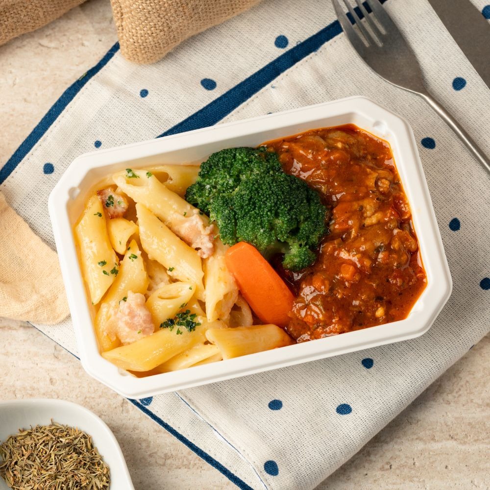 ▪️義式燴雞肉佐奶油筆管麵: 紅白雙醬,義式經典一次滿足
